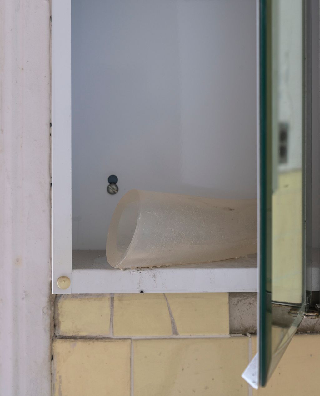 EXILE invited New York-based artist Gwenn Thomas and Vienna-based artist Kerstin von Gabain to respond to this temporal collision and create an immersive stage for their artworks. The selected works were deliberately not installed into but onto the existing space itself with some of the artworks’ material sources left in a state of flux themselves. Exposed to the elements, von Gabain’s soap pieces, shaped after human bone structures and arranged within the bathroom space, will begin to sweat and disintegrate over time. Thomas’s translucent glass shapes, their repetitive form taken from an abandoned found object and displayed in the bedroom’s cupboard, slowly pass the changing light of day. Both works respond to the spaces’ fluctuant nature and honor the opportunity to become short-lived, but active connectors between historical space and present visitor.