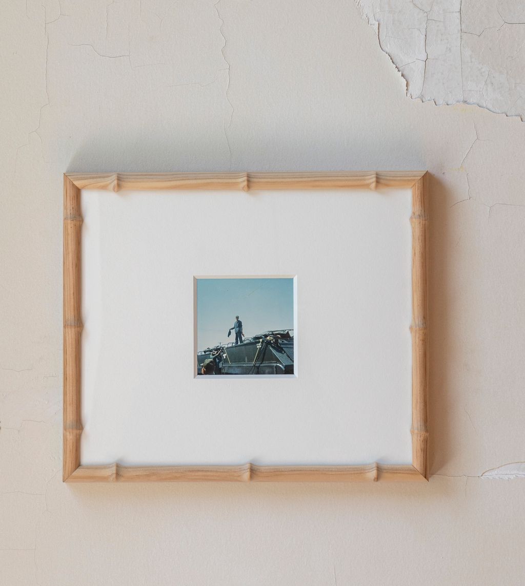 Selected for NADA House 2023 on Gov Island, and in consideration of the island’s history as an Army base, are a series of photographs taken in 1969-70 while Nurre’s father was enlisted with the United States Army along the Korean Demilitarized Zone. Frames for the photographs are made of white pine molding that has been hand carved into an exaggerated faux bamboo motif. Their archival matting is 8-ply. A male mannequin modeling a brass punch bowl from Korea and a type M1 US Army helmet is presented alongside the framed photographs.