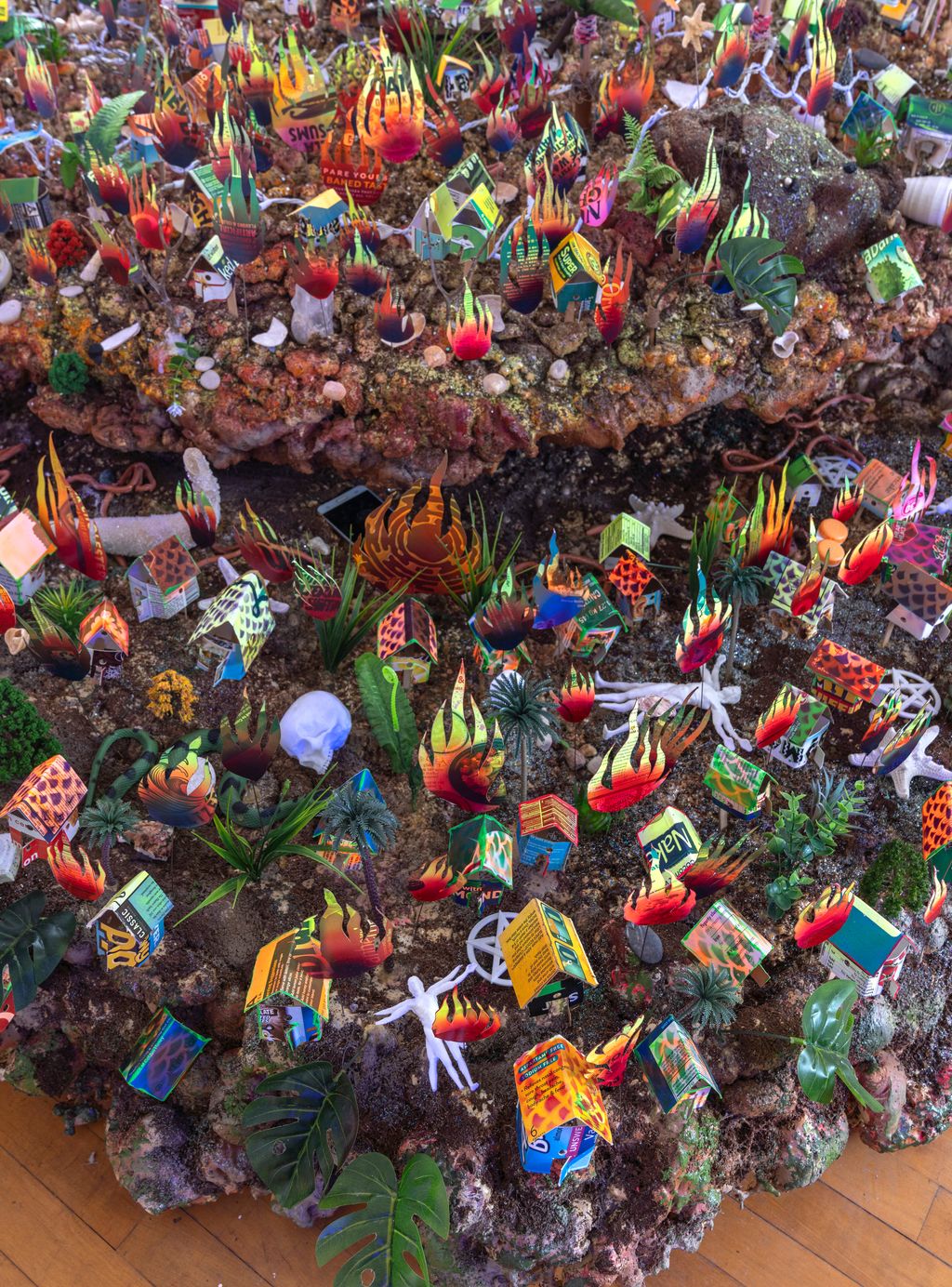Taking inspiration and its title from “The Panorama of the City of New York” by urban planner Robert Moses (permanent display; Queens Museum), “Tiered Panorama” was conceived as a para-fictional architectural model of a coastal city threatened by the rising oceans and societal collapse. Presented as a celebration of New York City’s infrastructure for the 1964 World’s Fair, “The Panorama of the City of New York” exudes a kind of monumental reverence for the built environment as one of the grandest achievements of humanity. In contrast, Estrada’s “Tiered Panorama” is a depiction of the built environment being retaken by the elements. Estrada’s postnatural diorama collages organic and artificial materials such as coconut fiber, miniature houses made from recycled cardboard, sea shells, Swarovski-encrusted bones, UV pigments, and 3D printed plastic talismans, creating a vibrant and gritty vision of modernity, literally glowing under the residue of Petrocapitalism.