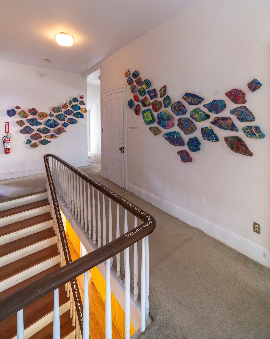 “Portals,” by Francisco Donoso, is a site-responsive installation of mixed-media paintings made on mylar, which are mounted on acrylic plexiglass supports that are shaped in forms inspired by the negative space of the chain-link fence. The shaped paintings are mounted to the walls backed with a wooden support that allows the pieces to “float” an inch off the wall, allowing for a subtle glow of color to surround each work, which reflects off the backs of the works. The shaped works, made in multiple sizes, are arranged in a sweeping composition that references both micro and macro life-forms, from the atomic scale to the cosmos. Donoso collapses simplistic binaries of here/there, in/out by creating what feels like celestial and terrestrial at the same time.