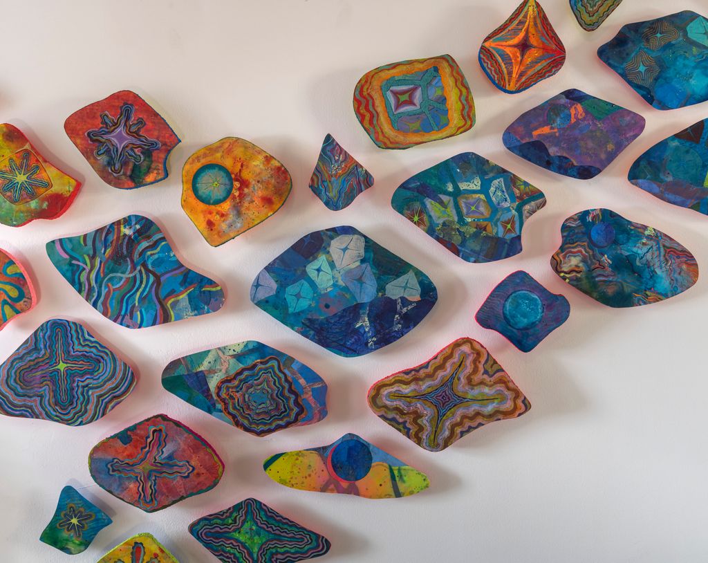 “Portals,” by Francisco Donoso, is a site-responsive installation of mixed-media paintings made on mylar, which are mounted on acrylic plexiglass supports that are shaped in forms inspired by the negative space of the chain-link fence. The shaped paintings are mounted to the walls backed with a wooden support that allows the pieces to “float” an inch off the wall, allowing for a subtle glow of color to surround each work, which reflects off the backs of the works. The shaped works, made in multiple sizes, are arranged in a sweeping composition that references both micro and macro life-forms, from the atomic scale to the cosmos. Donoso collapses simplistic binaries of here/there, in/out by creating what feels like celestial and terrestrial at the same time.