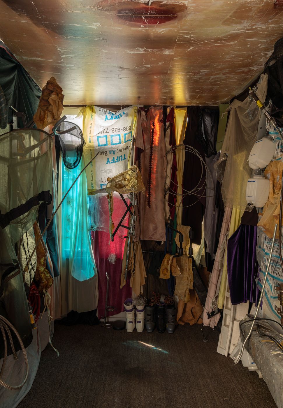 “Sorry to inform you” is a site-specific installation by Vladislav Markov featuring a trove of objects that are foundational in the artist’s process of synthesizing sculptures, as well as a massive ceiling-mounted pigment transfer painting. In the painting, Markov’s photogrammetric self-portrait in a post-surgery recovery mask is disengaged in the way a baby in utero lacks situational awareness during an ultrasound. Meanwhile, the myriad “discarded” objects cover the walls akin to a detritus-filled balcony in a Soviet-era prefabricated apartment building, its typical dwellers regularly choosing to block out the sun in order to gain some extra storage space.