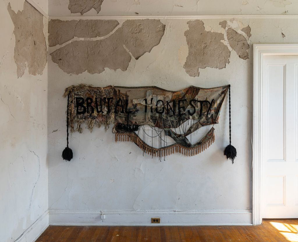 A painting of a cursed colourful mountains, appears as a gatekeeper between the old and new nations, its frame glowing with eerie knowledge. Beside the landscape, the broken wing of an angel lies in silent repose, and the delicate, broken wing of a butterfly reflects it like a mirror. Slogans promising revival after destruction are tightly embroidered on beautiful fabrics, but their optimism has been tarnished by time. A stained glass of the most sinful animal, the snake, is set in a rusted frame that still has drops of blood frozen on it.