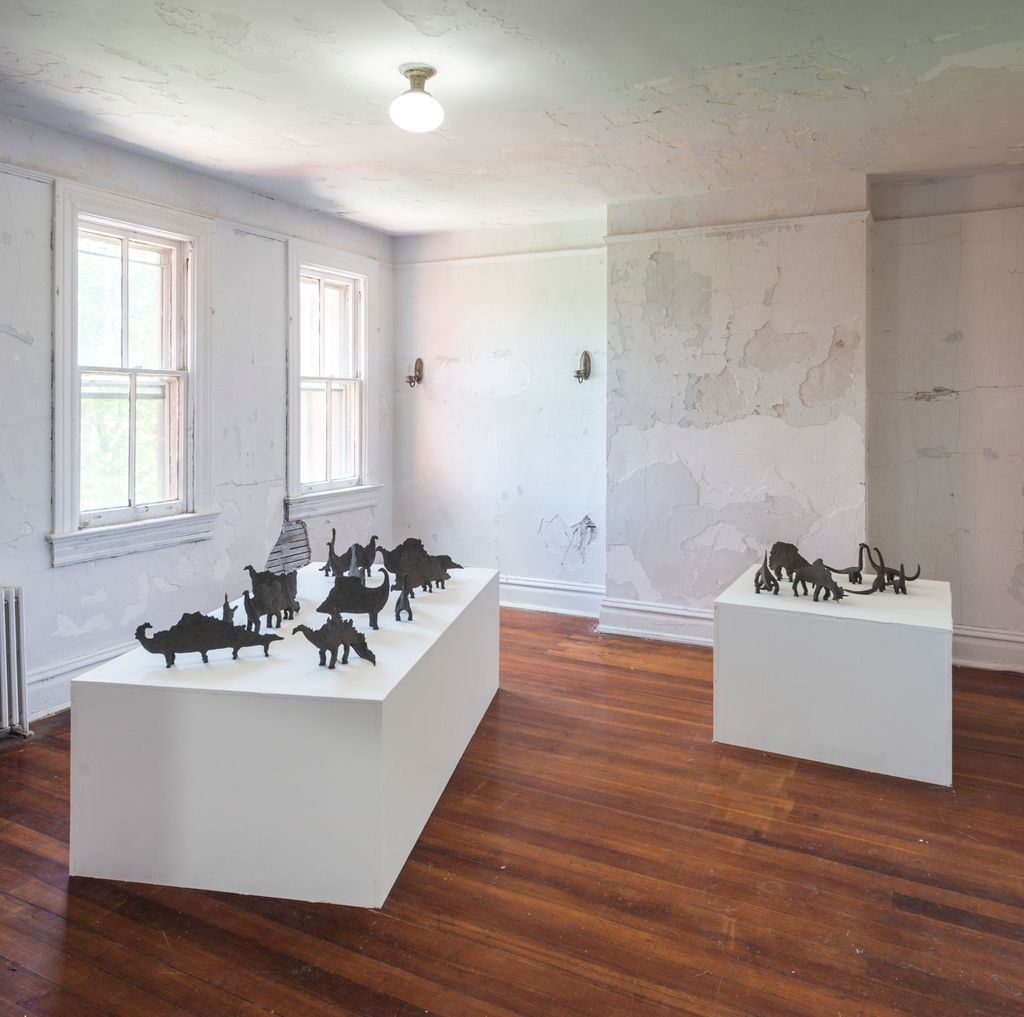 Arranged by typological groupings between two platforms, the black stoneware sculptures (part of an ongoing series), resemble bulls, dinosaurs and hybrid beasts. Together, they encompass a personal etymology of shape, texture and type.