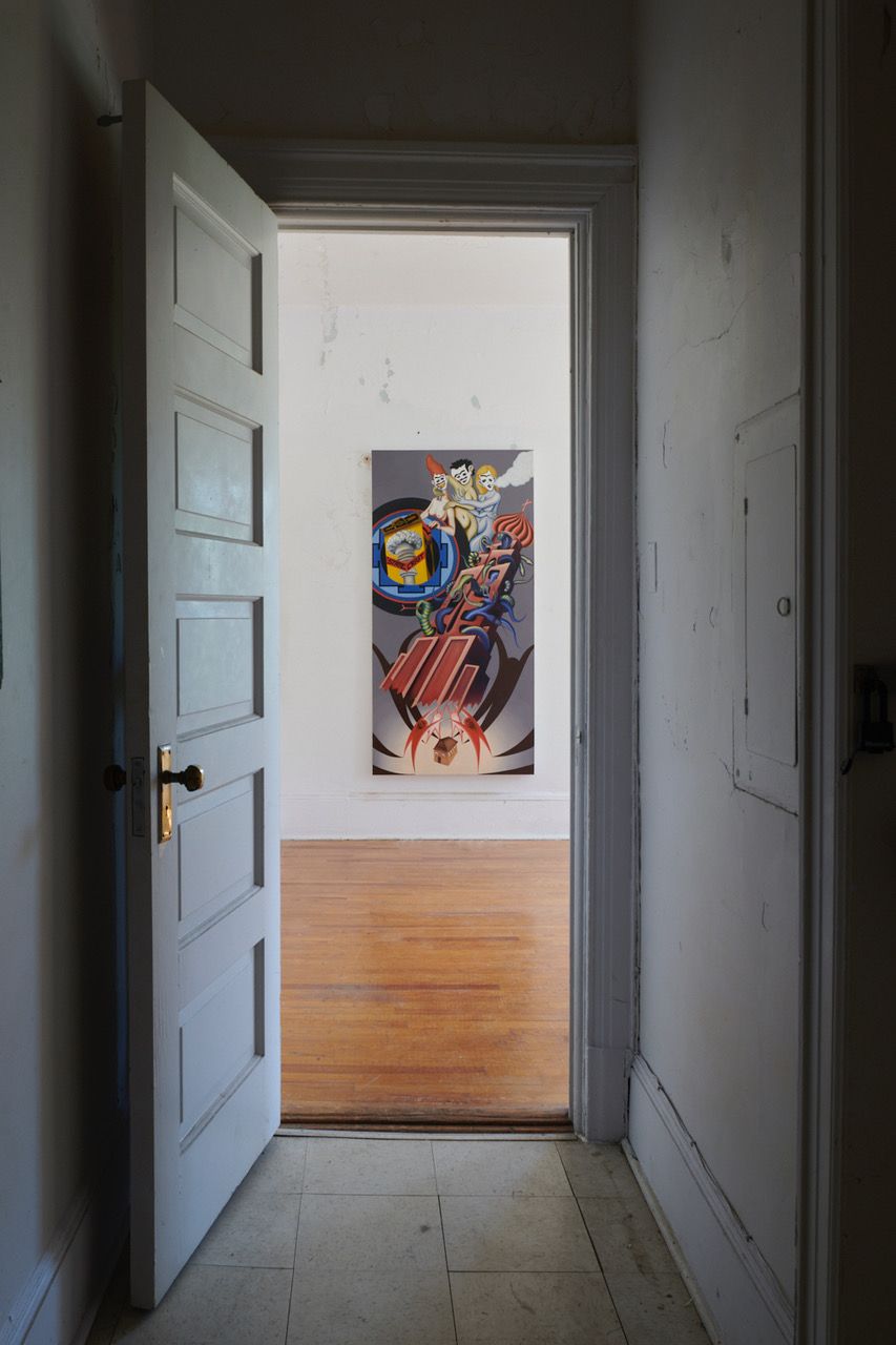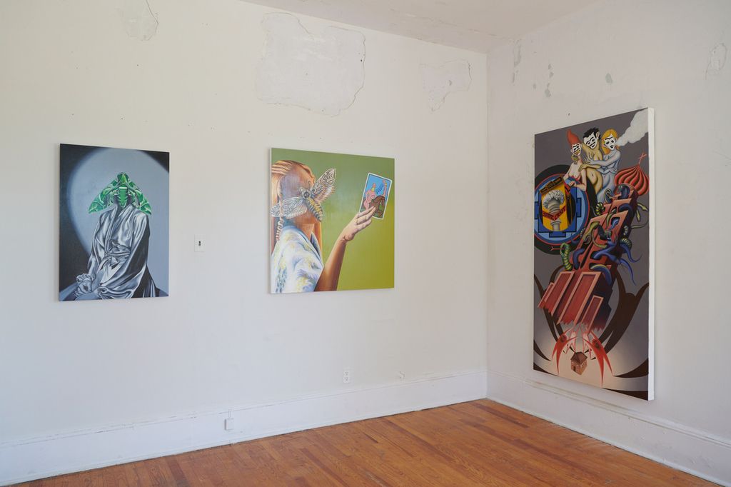 Lucia Love’s visually rich paintings are loaded with references to art history, mythology, politics, and the dynamics of power. The symbolism in this new group of paintings refers to the dyads of oppositional states, such as doom and hope, and solidarity and isolation. These works depict flight or weightlessness in one form or another: the characters in her paintings operate within a state of suspension between dual forces. Love’s unusual painting style is well represented here—particularly her ability to incorporate multiple techniques, such as hyperrealism, brushy gestures, and a flat, cartoonish line into cohesive and dynamic compositions.