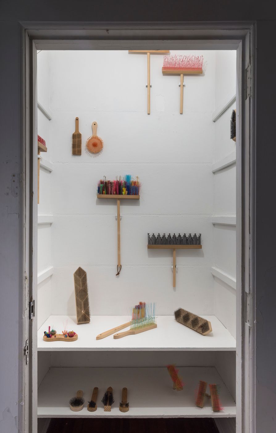 Michelle Rosenberg collects dirty and abandoned brooms and brushes discovered throughout the city. These materials embody the activity of cleaning, the untold stories of domestic labor, and mass produced disposable culture. Reconfiguring the found bristles in various optical compositions, the sculptures are transformed into renewed objects of desire.