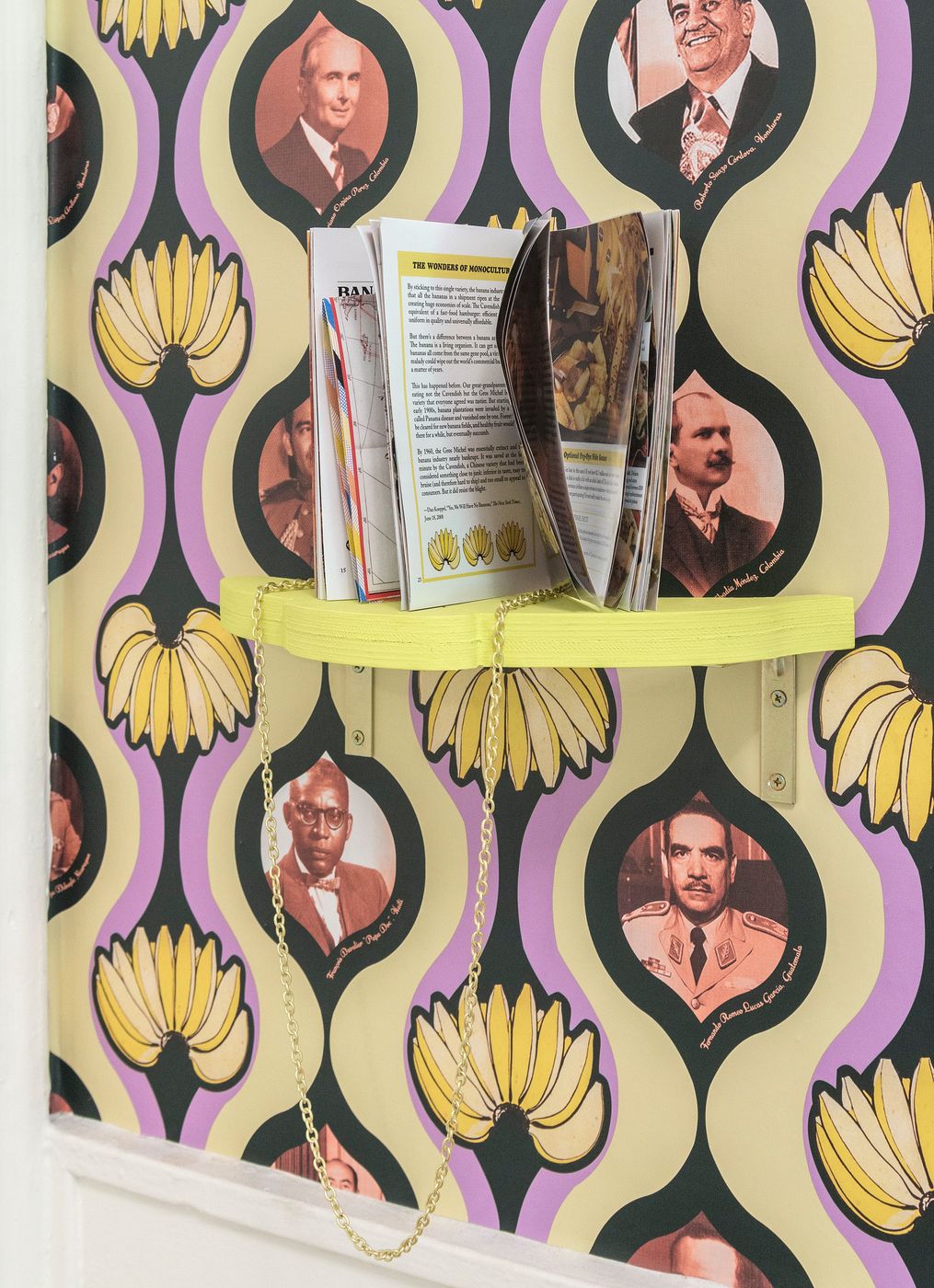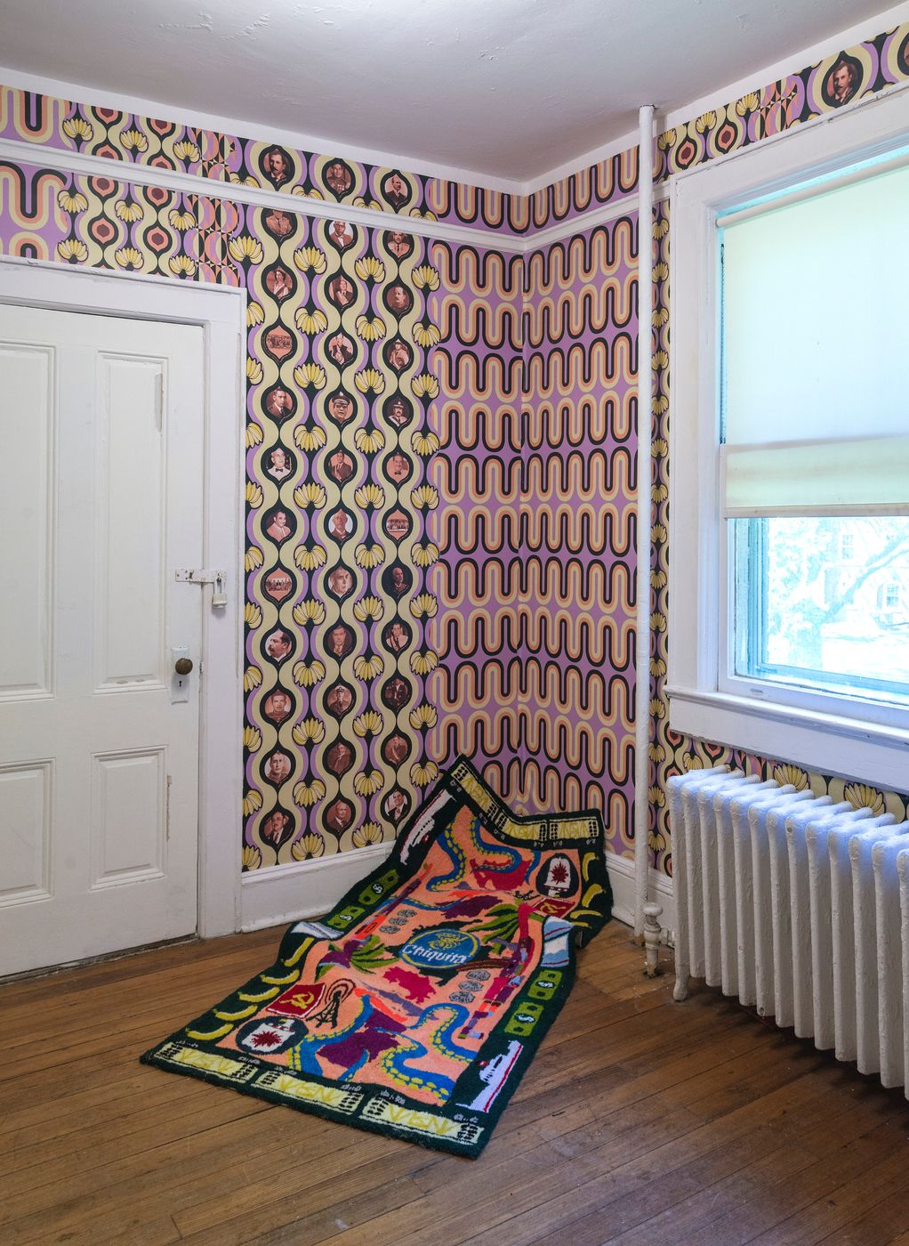 "Above the Fruited Plain (America! America!)" features "War Rug X (Banana Republics/US Intervention in Latin America)," a machine-tufted rug. The work is part of Herr’s ongoing "War Rugs From America" series—rugs which use the material and visual narrative strategies of Afghan War Rugs to interrogate state-sanctioned violence in America. "War Rug X" applies this rhetoric to the violent legacy of American intervention—corporate and military—in Central America and the Caribbean. The rug is paired with a work on paper, "The Chemical Composition Of a Coup"; a subversive tropical wallpaper; and "Banana Republican Recipes" in collaboration with writer Cara Marsh Sheffler.