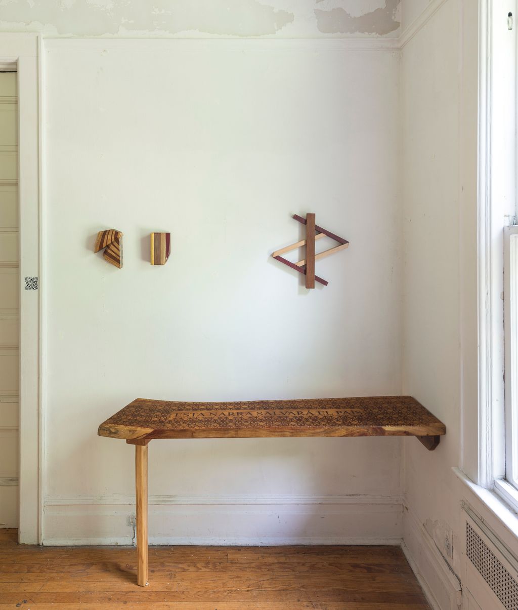 For NADA House 2021 Zawahra Alejandro presents "Salvanomía"; recent sculptures by Quintín Rivera Toro. “Salvanomía” is a made up term combining the spanish words “salvación” (salvation) and “dasonomía” (dasonomy)—the study of forests. Quintín engraves the words “This wood will save the country” into functional sculptures as a way to create talismans and as a form of prayer. He resignifies the resource of wood as a political material, during economic and political hardship. In this exhibit there are three functional sculptures: a bench (almond tree), a shelf (eucalyptus tree) and a bar table top (bullet tree).
