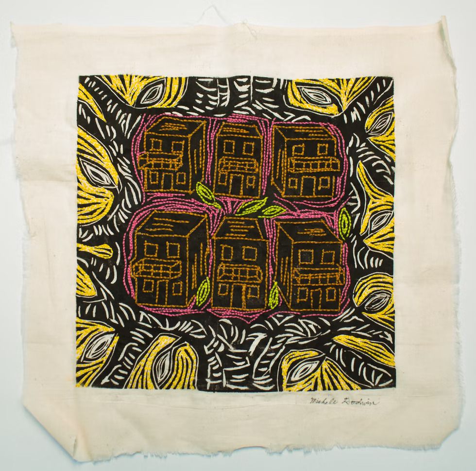 Michele Godwin, 2020, relief and embroidery on muslin. Courtesy of EFA Robert Blackburn Printmaking Workshop, New York.